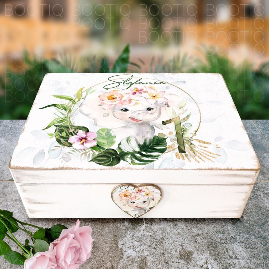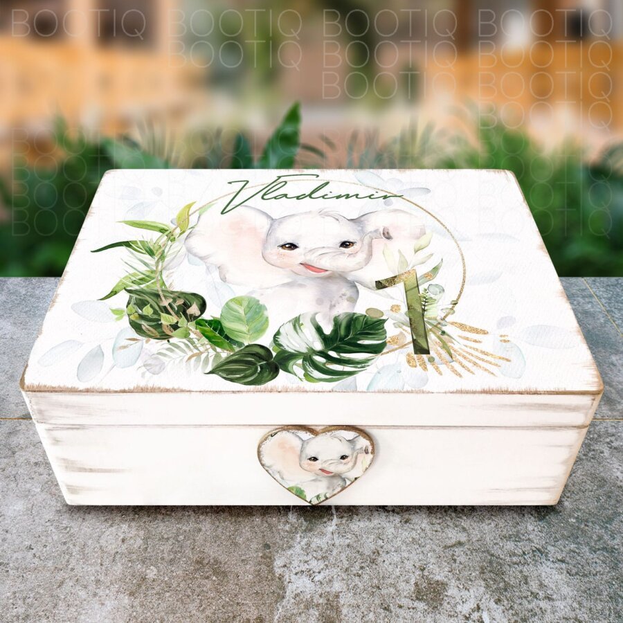 Cutie din Lemn Savanna Elephant – Cutie personalizata din lemn pentru amintiri, botez sau aniversare