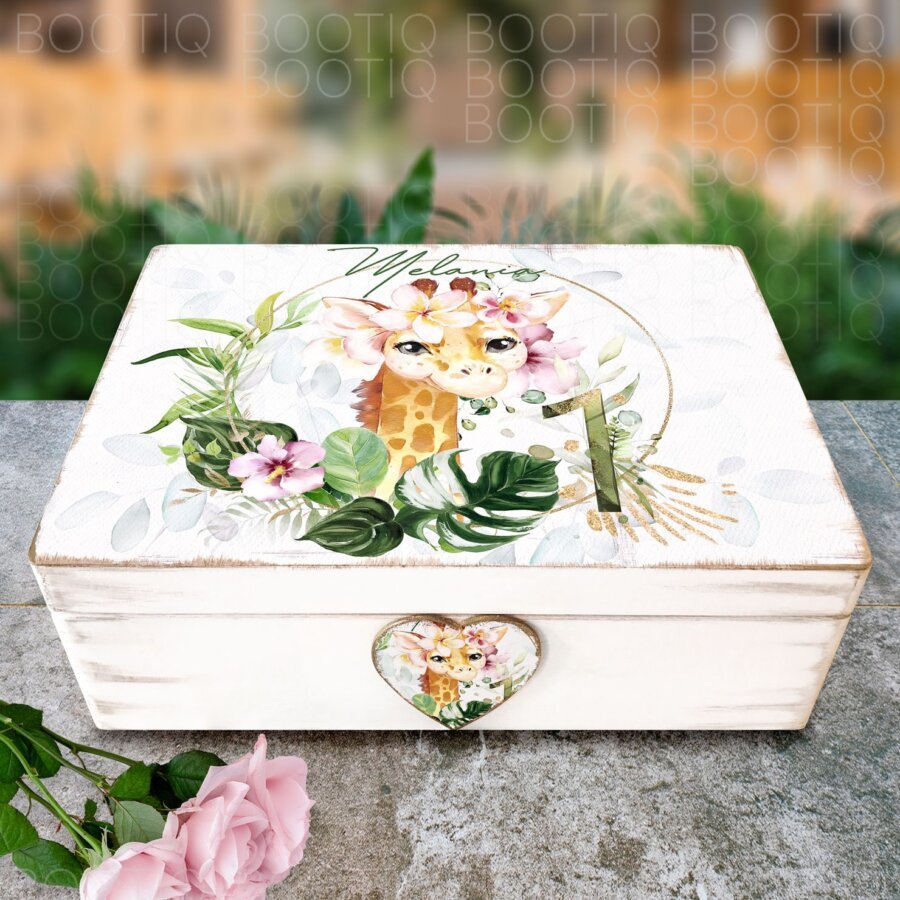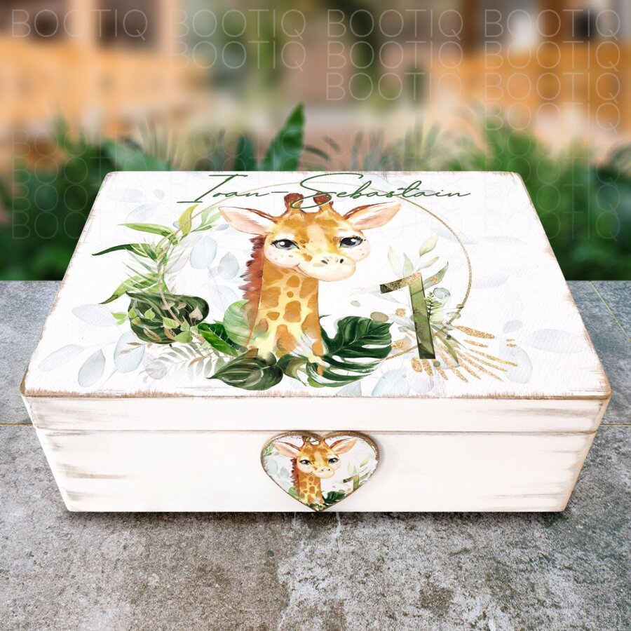 Cutie din Lemn Savanna Giraffe – Cutie personalizata din lemn pentru amintiri, botez sau aniversare