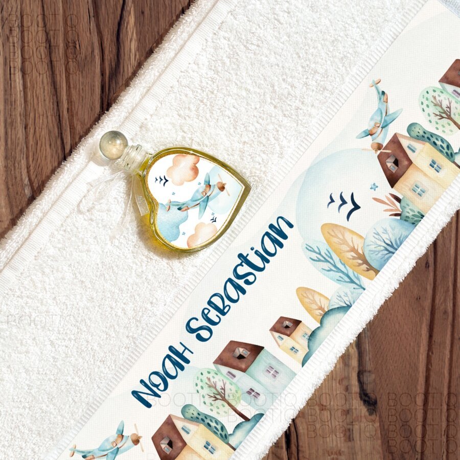In cutie vei regasi suplimentar un prosop, o panza de mir, o sticluta de mir si o fasa de botez. Prosopul pentru botez este pufos si se personalizeaza prin imprimare digitala cu aceleasi ilustratii watercolor de pe cutie dar si cu numele micutului. Prosopul este realizat din bumbac organic premium si se spala la temperatura de 40C. Panza de mir este țesuta in stil traditional din fire premium unice de bumbac 100% organic. Panza are un tușeu confortabil si bland si este personalizata digital in acelasi stil. Conform traditiei si cerintelor bisericii, materialul nu se tiveste – astfel ca trebuie spalata cu grija pentru a nu se desira. Sticluta de mir este personalizata si are forma de inimioara si un capac de sticla cu inchidere ermetica. In sticluta incap ~60ml de ulei. Fasa de botez este realizata din bumbac 100%, are o textura de panza si un aspect usor dantelat. Este personalizata discret cu numele bebelusului scris cu auriu.