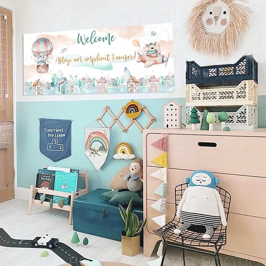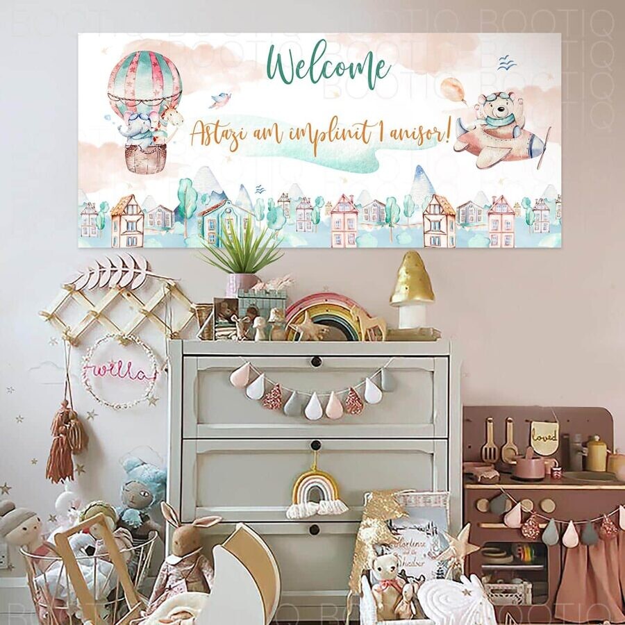 Imprimat pe o hartie speciala in format orizontal – semnul de bunvenit se lipeste pe perete pentru a da o nota tematica, in acelasi stil, incaperi in care organizezi petrecerea.