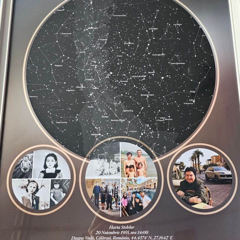 Realizam tablouri cu harta stelara din 2017, ele au ajuns la mii de clienti din toate colturile tarii. Tablourile cu harta stelelor si inregistrare sunt unicat si au fost oferite cadou in special pentru nunta dar si pentru aniversarea unor (foarte) importante personalitati si celebritati din Romania.