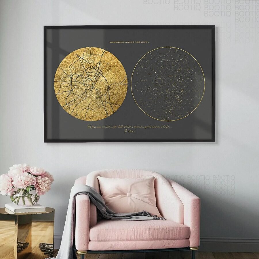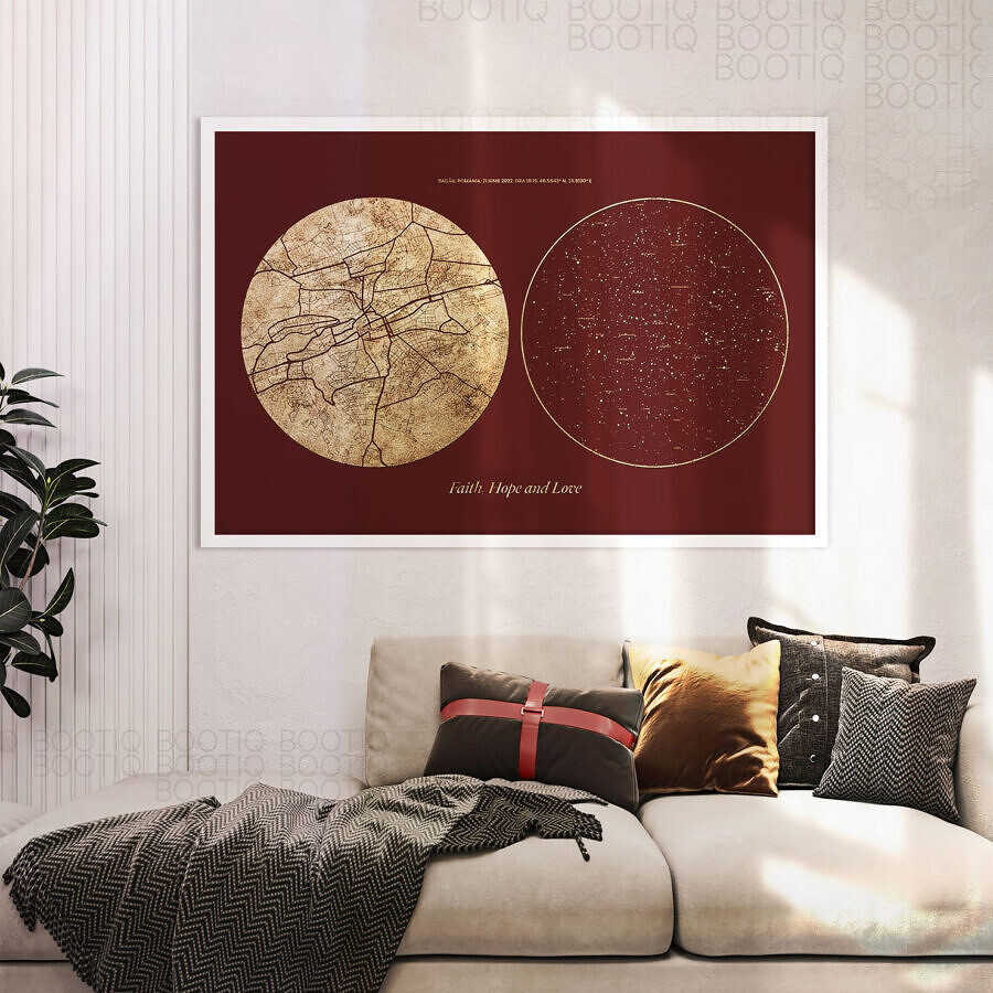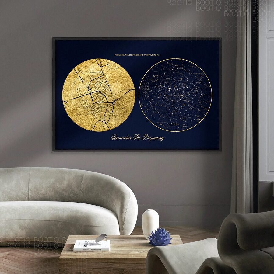 A fost primul sărut sau nașterea unui copil acel moment cand ai realizat că lumea s-a schimbat. Ofera cadou harta stelelor pentru a vă aminti impreuna întotdeauna acea clipa minunata care a trezit in inimile voastre emotii si sentimente de care nu erati constienti ca pot exista. Creează o hartă a stelelor de 40x50cm, 50x70cm sau chiar 60x90cm pentru noaptea în care inima ți-a sărit o bătaie. Folosim cele mai noi tehnologii de imprimare astfel incat tabloul tau sa fie la cea mai buna calitate.