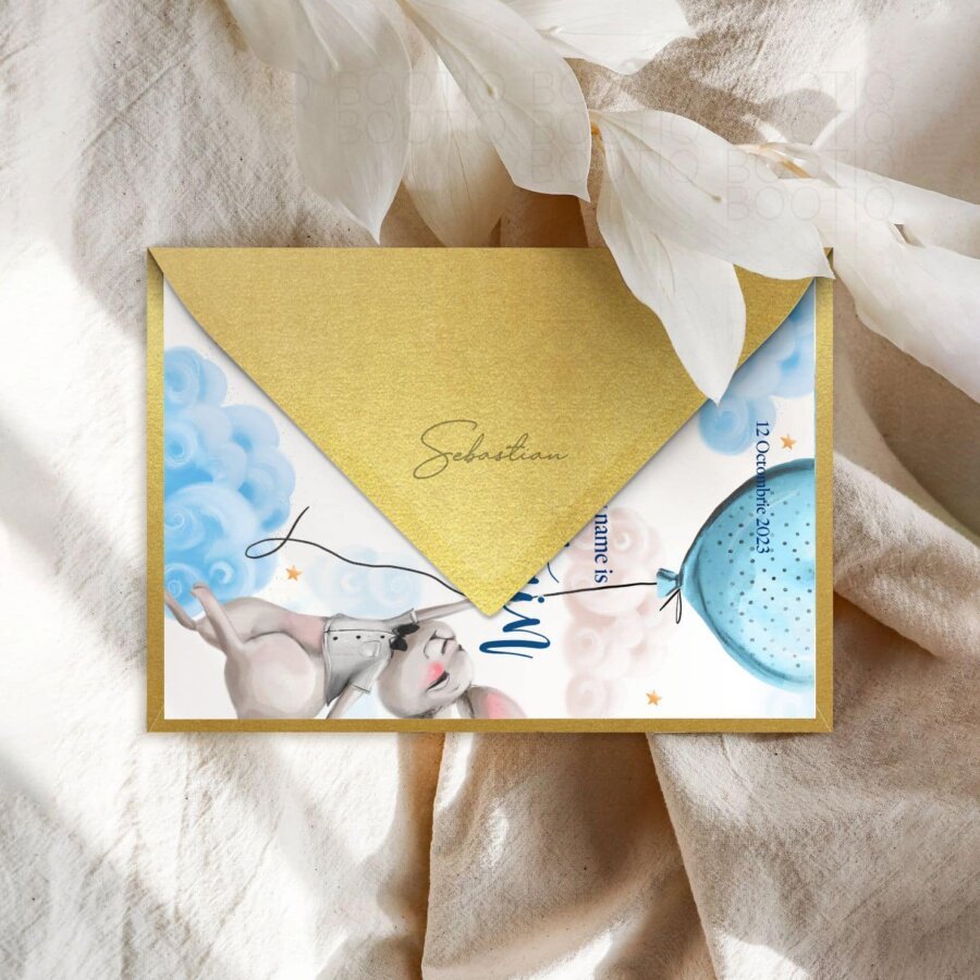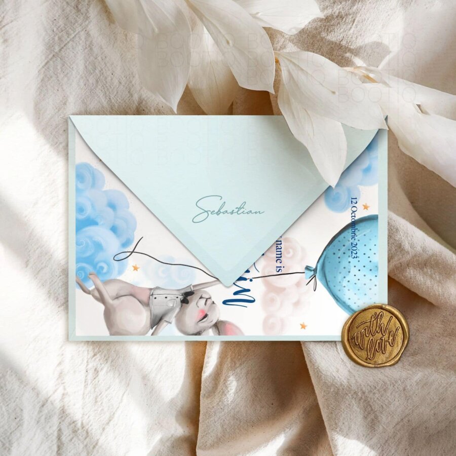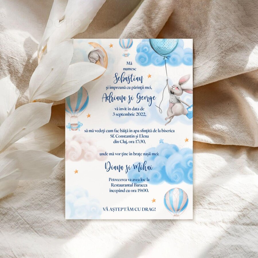 Invitatia pentru botez “Bunny in the Sky” a fost conceputa special de designerii nostri pentru ca tu sa retraiesti bucuria copilariei.