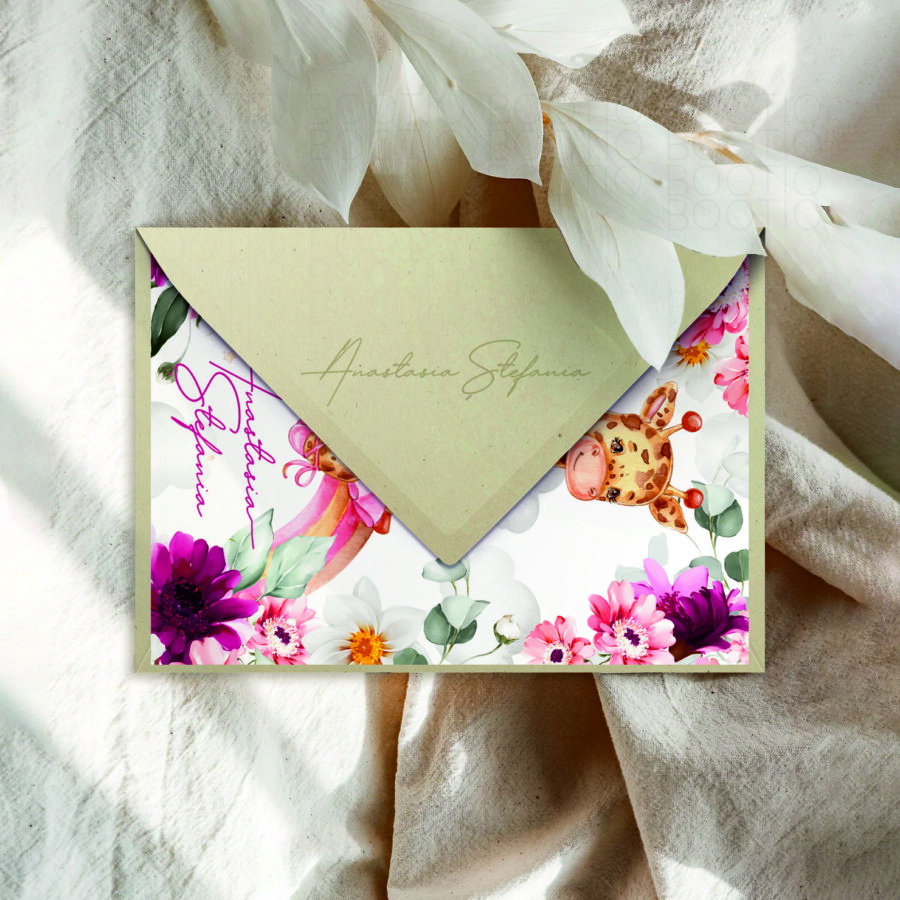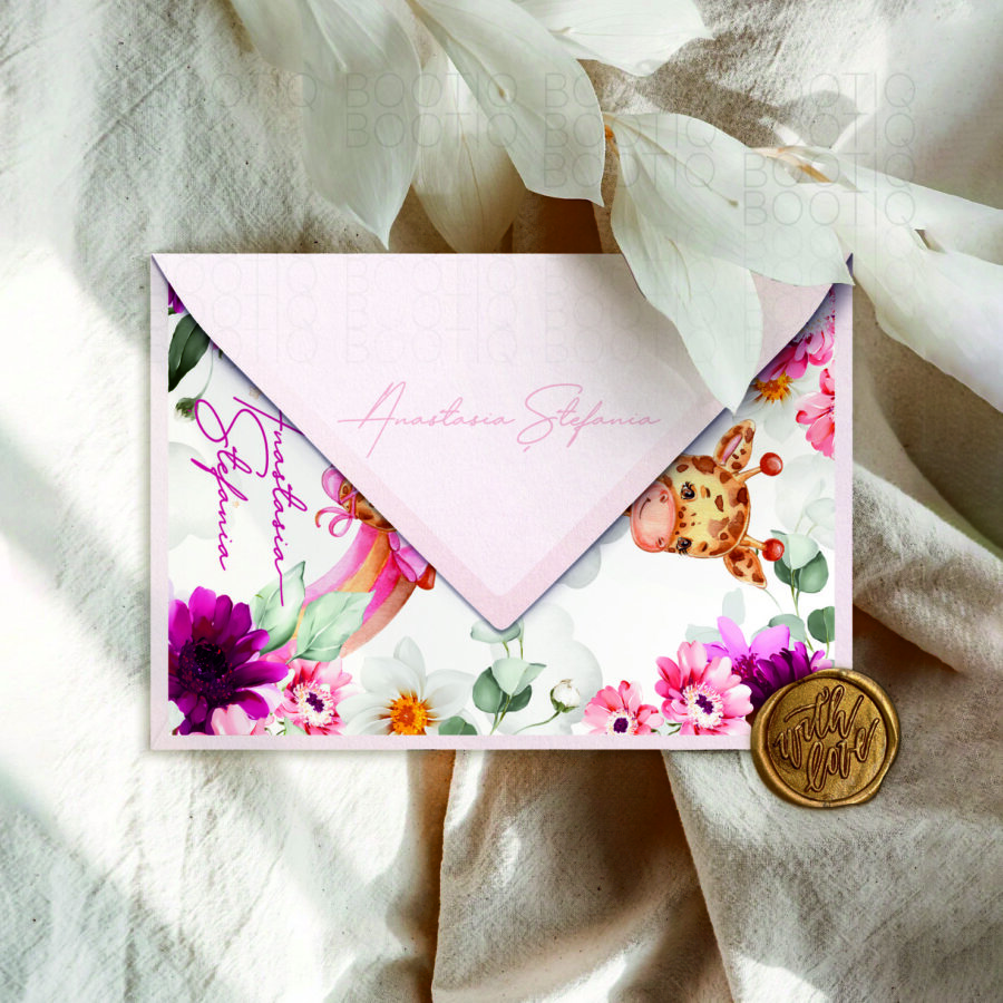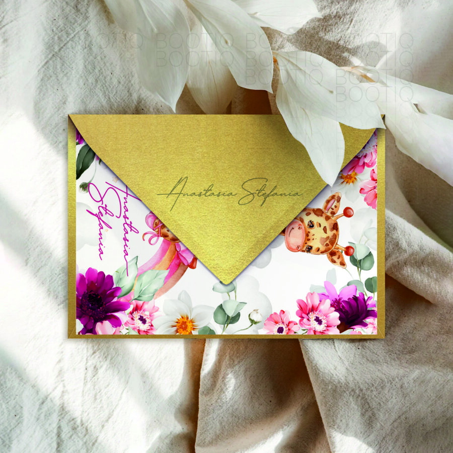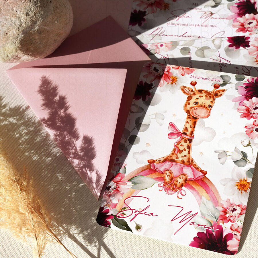 Ti-ai privit prichindelul in ochi din primele sale clipe si ai stiut din acel moment ca intreaga ta viata o vei da in schimbul unor avalanse de zambete pe fata copilului tau. Celebreaza aniversarea sau botezul celui mic in cel mai jucaus si colorat mod posibil. Invitatia pentru botez “Girafa Simpatica” a fost conceputa special de designerii nostri pentru ca tu sa retraiesti bucuria copilariei si pentru a intipari pe fetele celor apropiati un zambet incarcat de spiritul ludic al celei mai frumoase perioade din viata fiecaruia: copilaria.