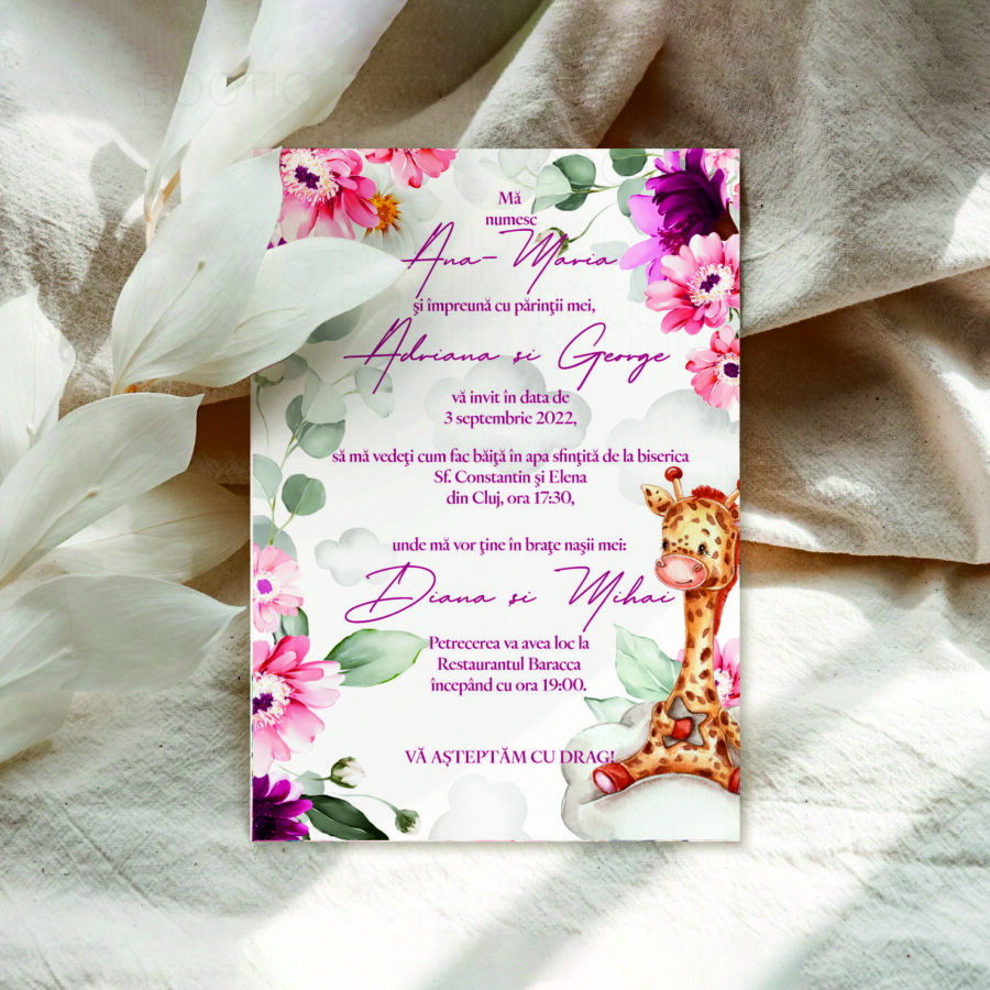 Invitatie de botez personalizata “Girafa Simpatica” – Copilaria este sinonim pentru fericire, iubire, joaca si culoare. Copilaria este cel mai frumos dar pe care viata ni-l ofera, asa ca merita sa fie pretuit la adevarata sa valoare.