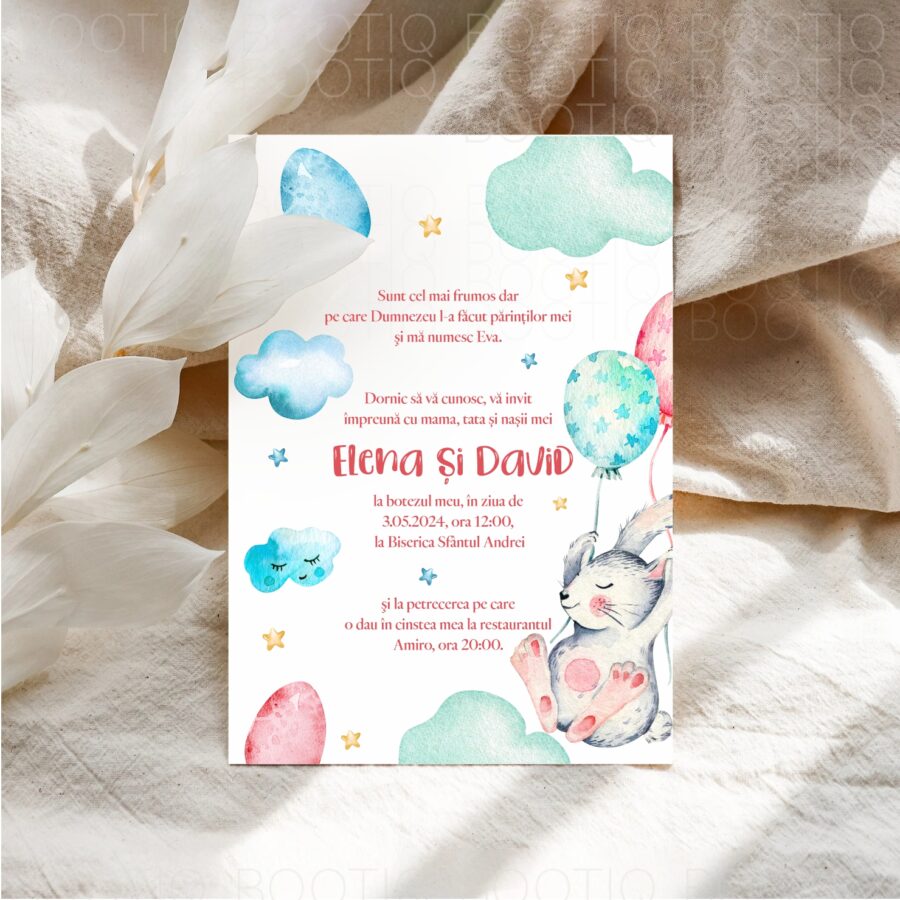 Invitatie de botez personalizata “Happy Bunny” – Copilaria este sinonim pentru fericire, iubire, joaca si culoare. Copilaria este cel mai frumos dar pe care viata ni-l ofera, asa ca merita sa fie pretuit la adevarata sa valoare.