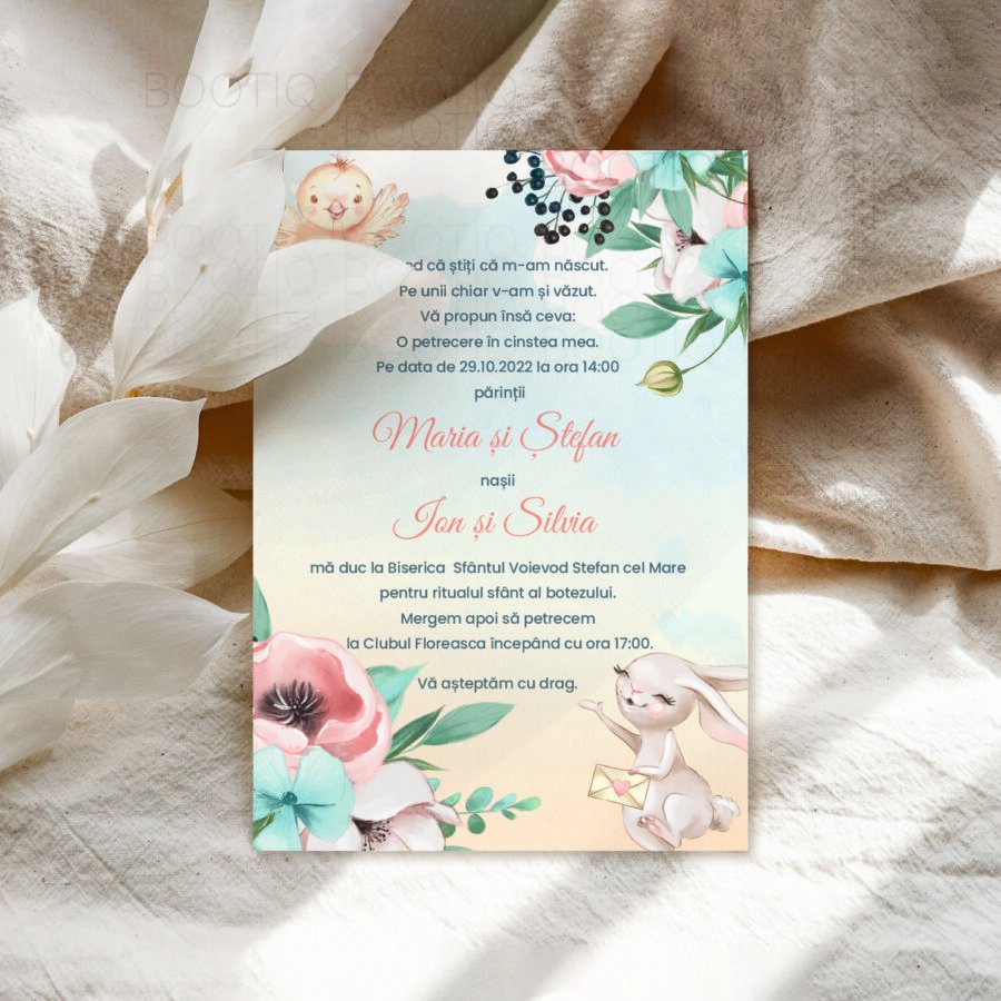 Invitatie de botez personalizata “Springtime Garden” – Copilaria este sinonim pentru fericire, iubire, joaca si culoare. Copilaria este cel mai frumos dar pe care viata ni-l ofera, asa ca merita sa fie pretuit la adevarata sa valoare.