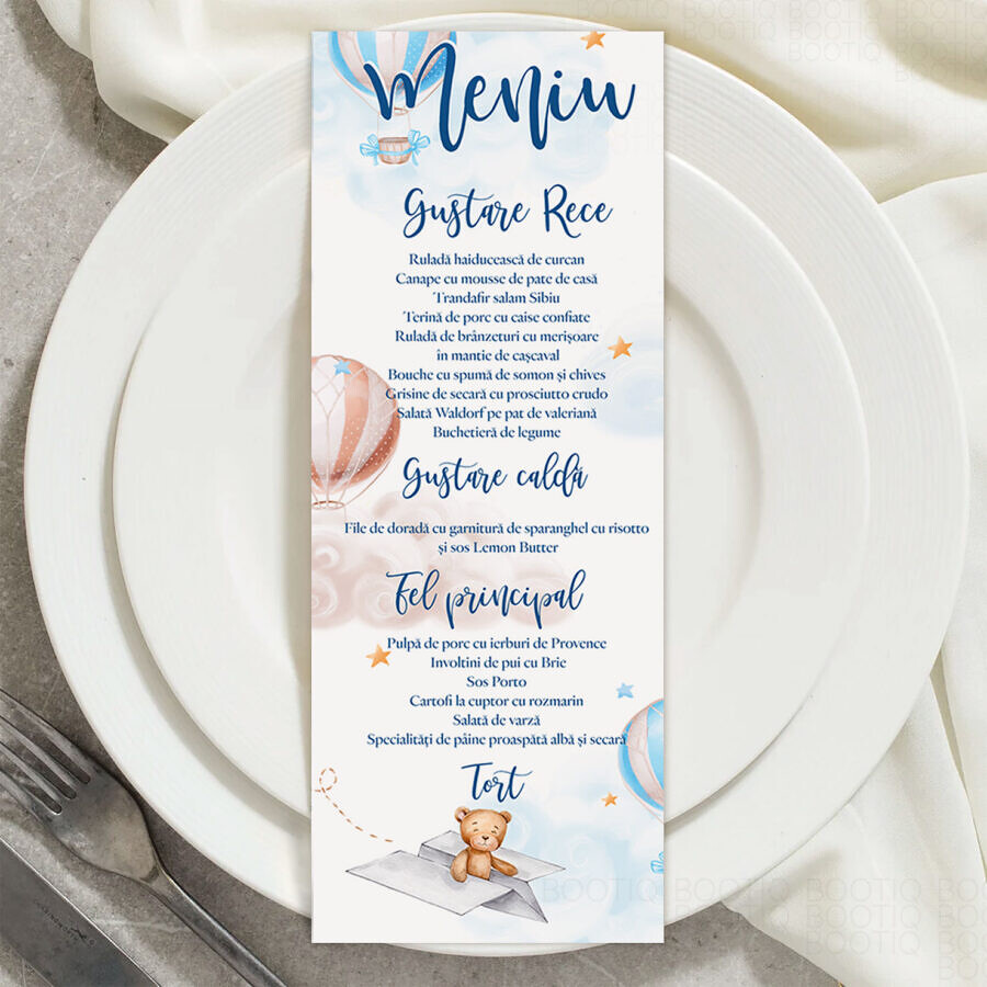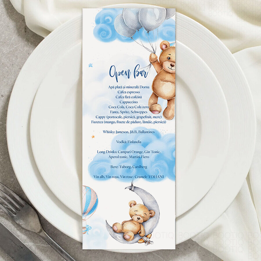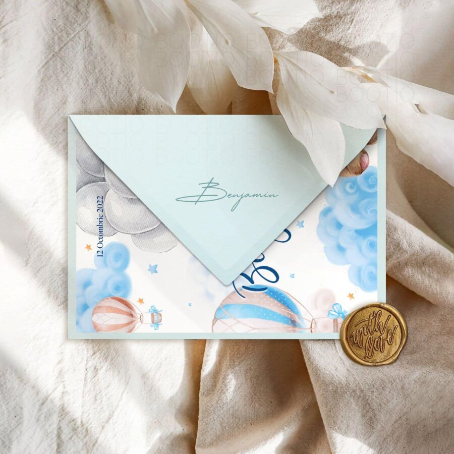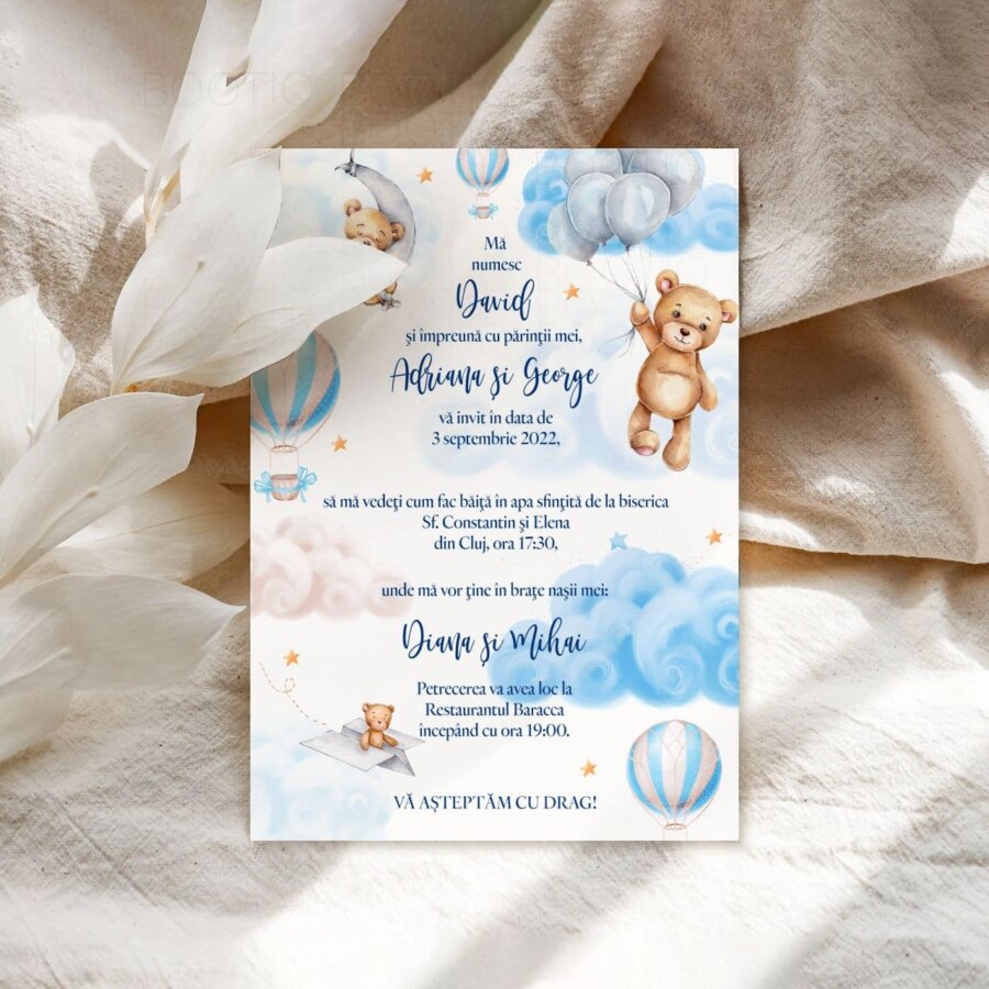 Invitatie de botez personalizata “Teddy in the Sky” – Copilaria este sinonim pentru fericire, iubire, joaca si culoare. Copilaria este cel mai frumos dar pe care viata ni-l ofera, asa ca merita sa fie pretuit la adevarata sa valoare.