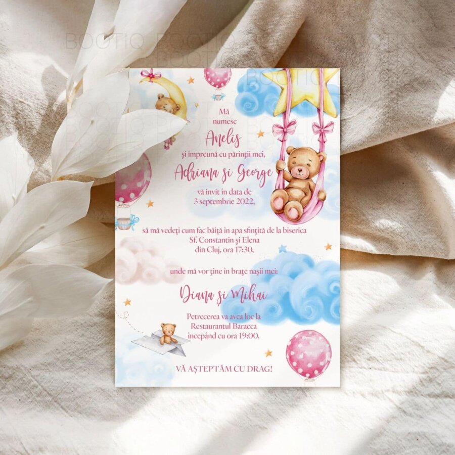Ti-ai privit prichindelul in ochi din primele sale clipe si ai stiut din acel moment ca intreaga ta viata o vei da in schimbul unor avalanse de zambete pe fata copilului tau. Celebreaza aniversarea sau botezul celui mic in cel mai jucaus si colorat mod posibil. Invitatia pentru botez “Teddy Girl” a fost conceputa special de designerii nostri pentru ca tu sa retraiesti bucuria copilariei si pentru a intipari pe fetele celor apropiati un zambet incarcat de spiritul ludic al celei mai frumoase perioade din viata fiecaruia: copilaria.