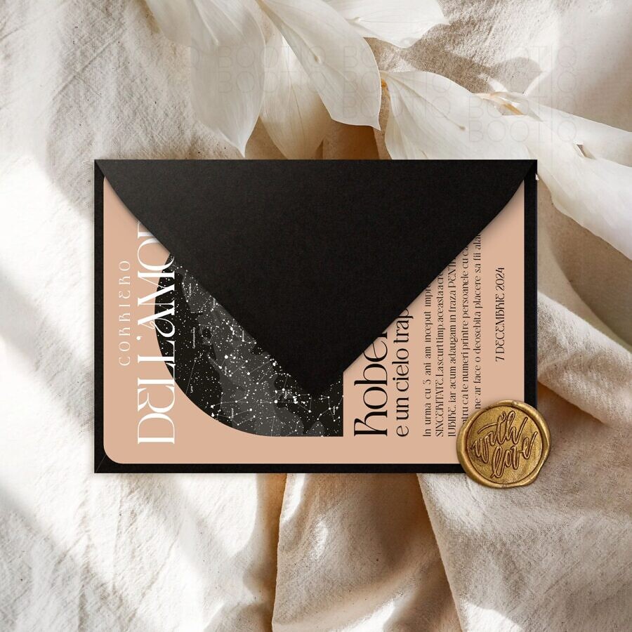 Invitația dezvăluie promisiunea unei iubiri veșnice sub un cer de stele. Pe un fundal delicat, roz pal, se conturează harta stelară din misterioasa seară a nuntii, sugerând destinul scris în stele al cuplului. Numele mirilor sunt printate într-un font modern și stilizat, într-un stil futurist Eclectic. Această capodoperă de design invită la o sărbătoare sub semnul stelelor, acolo unde doi îndrăgostiți își vor uni destinele sub același cer.