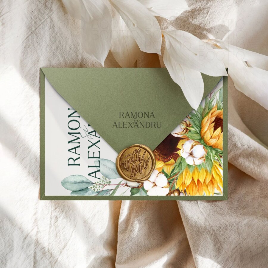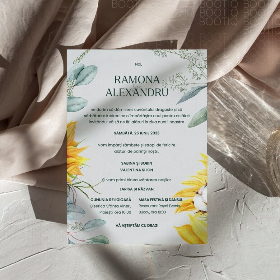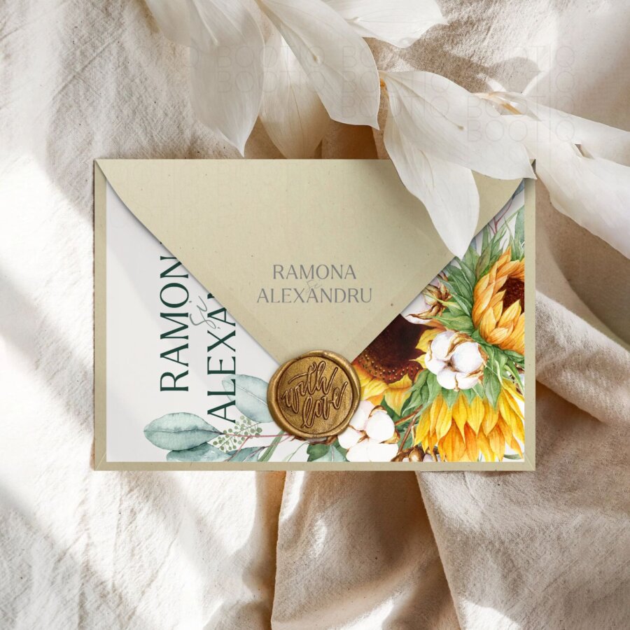 Emoţiile puternice pe care le trăim, nu de puţine ori au consecinţe ireparabile asupra întregii noastre existenţe. Emoţiile pot dura numai câteva clipe, dar amintirea lor durează o viaţă întreagă. Celebrează dragostea cu invitatia de nuntă “Sunflower Love” cu un design special conceput de designerii noştri, pentru unul dintre cele mai importante momente din viaţa ta: căsătoria. Alege să îţi impresionezi apropiaţii cu acest design delicat şi de efect şi oferă-le emoţia unei amintiri care să dureze o viaţă întreagă.