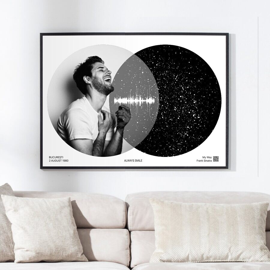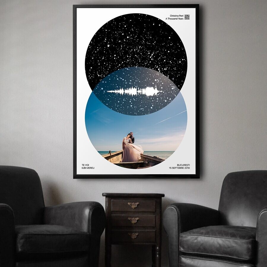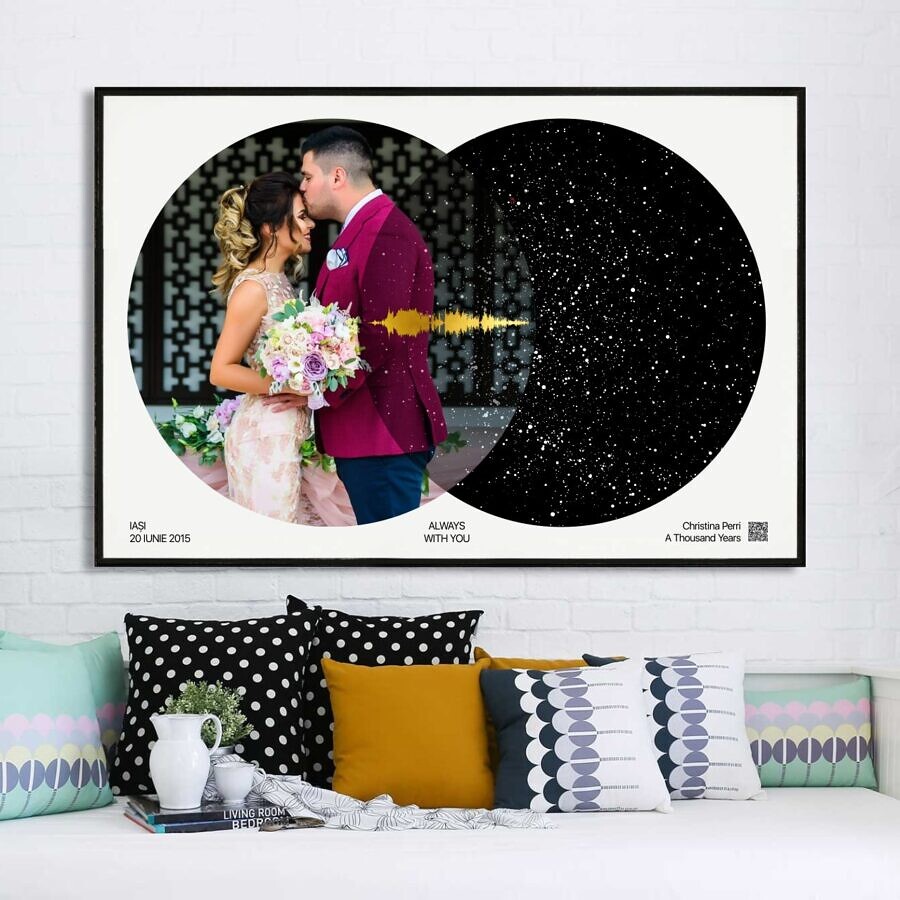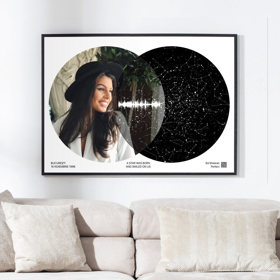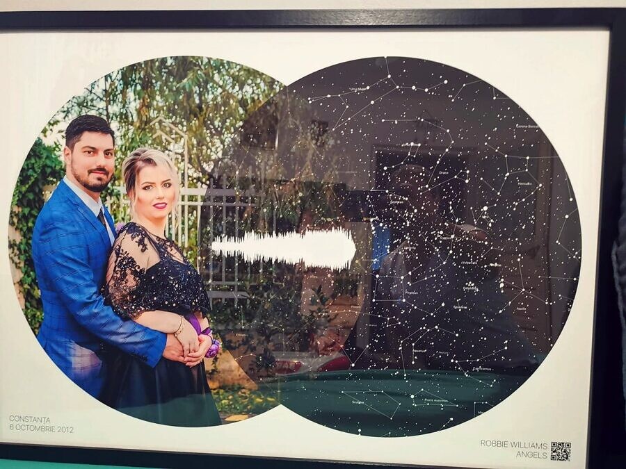 Tabloul are dimensiunea de 50×70 centimetri sau 60x90cm si, indiferent de faptul ca evenimentul tau drag s-a petrecut in timpul zilei, acest lucru nu trebuie sa te ingrijoreze, deoarece, desi nu le vedem, stelele sunt acolo in permanenta si stralucesc la fel de puternic in orice moment.