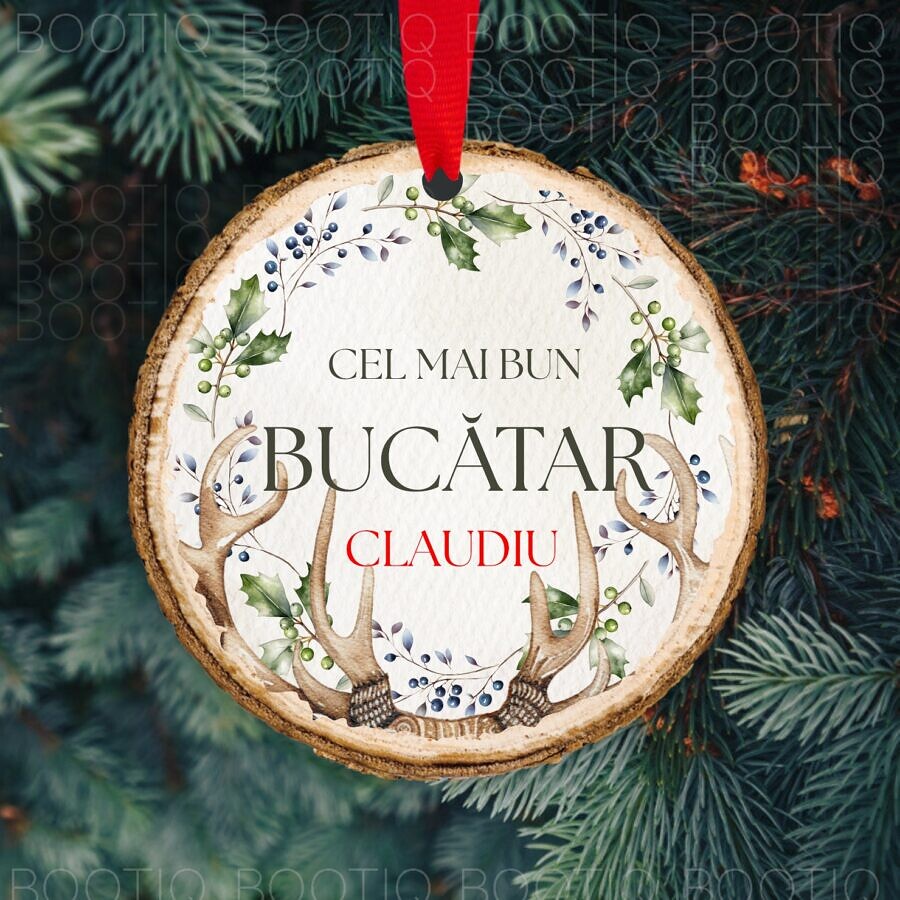 Această decorațiune de brad încapsulează farmecul sărbătorilor și caldura recunoștinței personalizate. Realizată dintr-o felie autentică de lemn, fiecare ornament de aproximativ 10 cm în diametru și 8 mm grosime devine o medalie pentru aprecierea celor dragi. Pe o față, ilustratia delicată a unui cap de ren și motive florale adaugă un strop de natură în decorul festiv, în timp ce pe verso, cuvinte alese cu afecțiune dezvăluie aprecierea personală: un titlu, un nume, o profesie, toate învăluite în creativitate.