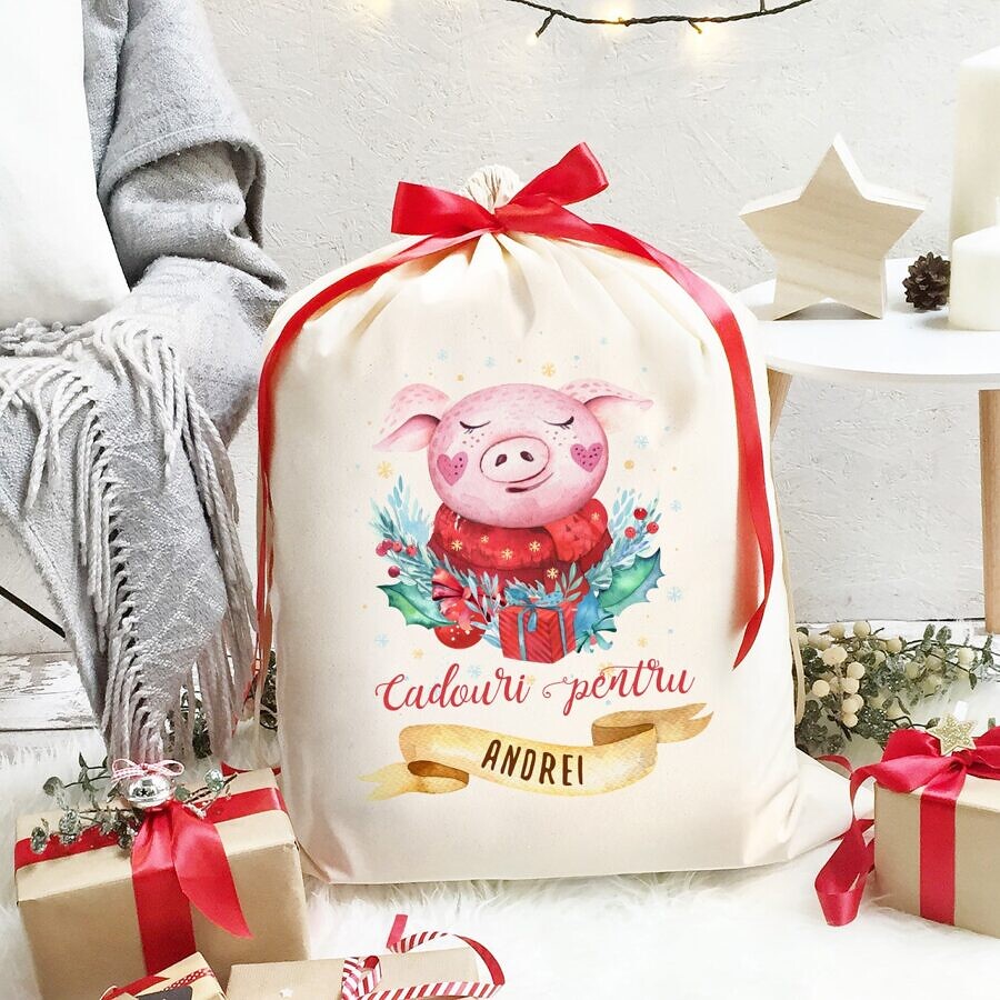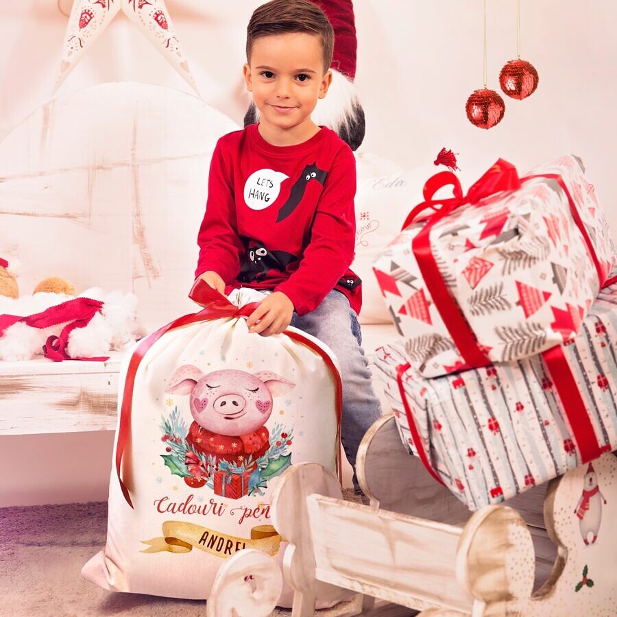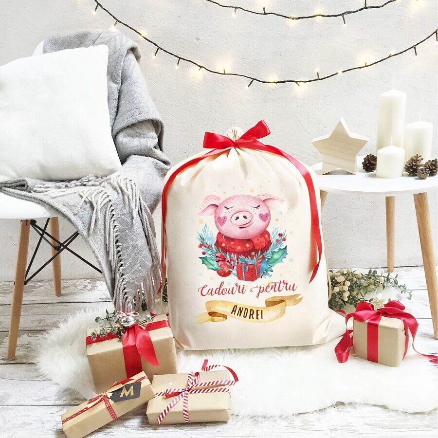 Sacul Mosului – Sac de Craciun personalizat de la ajutorul Mosului Purcelusul Vesel