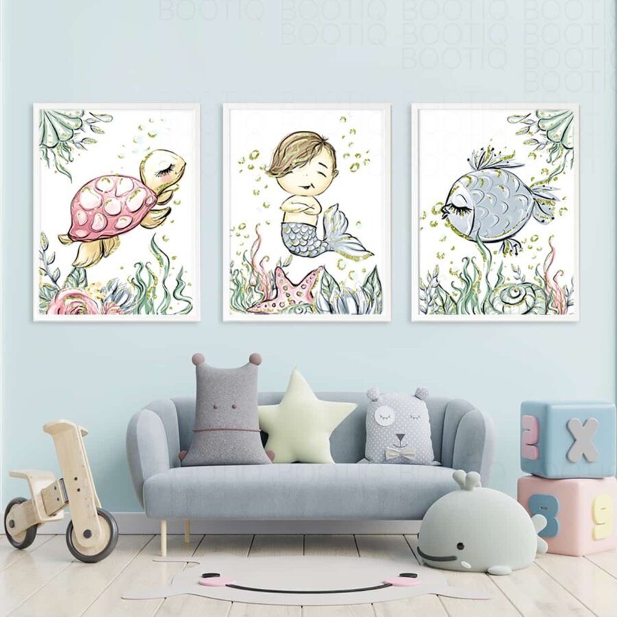 Setul de tablouri Cute Little Boy Mermaid pentru camera copiilor ofera o pata de culoare si ii incurajeaza imaginatia prichindelului tau. Acest set modern de personaje colorate va aduce un plus de culoare si energie pozitiva pentru orice gradinita sau dormitor de copii.