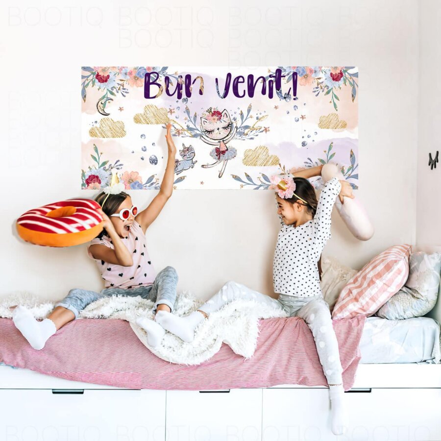 Imprimat pe o hartie speciala in format orizontal – semnul de bunvenit se lipeste pe perete pentru a da o nota tematica, in acelasi stil, incaperi in care organizezi petrecerea.