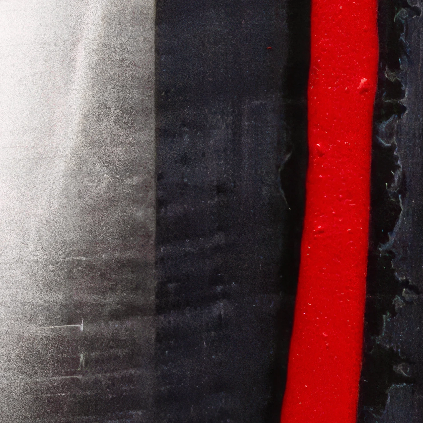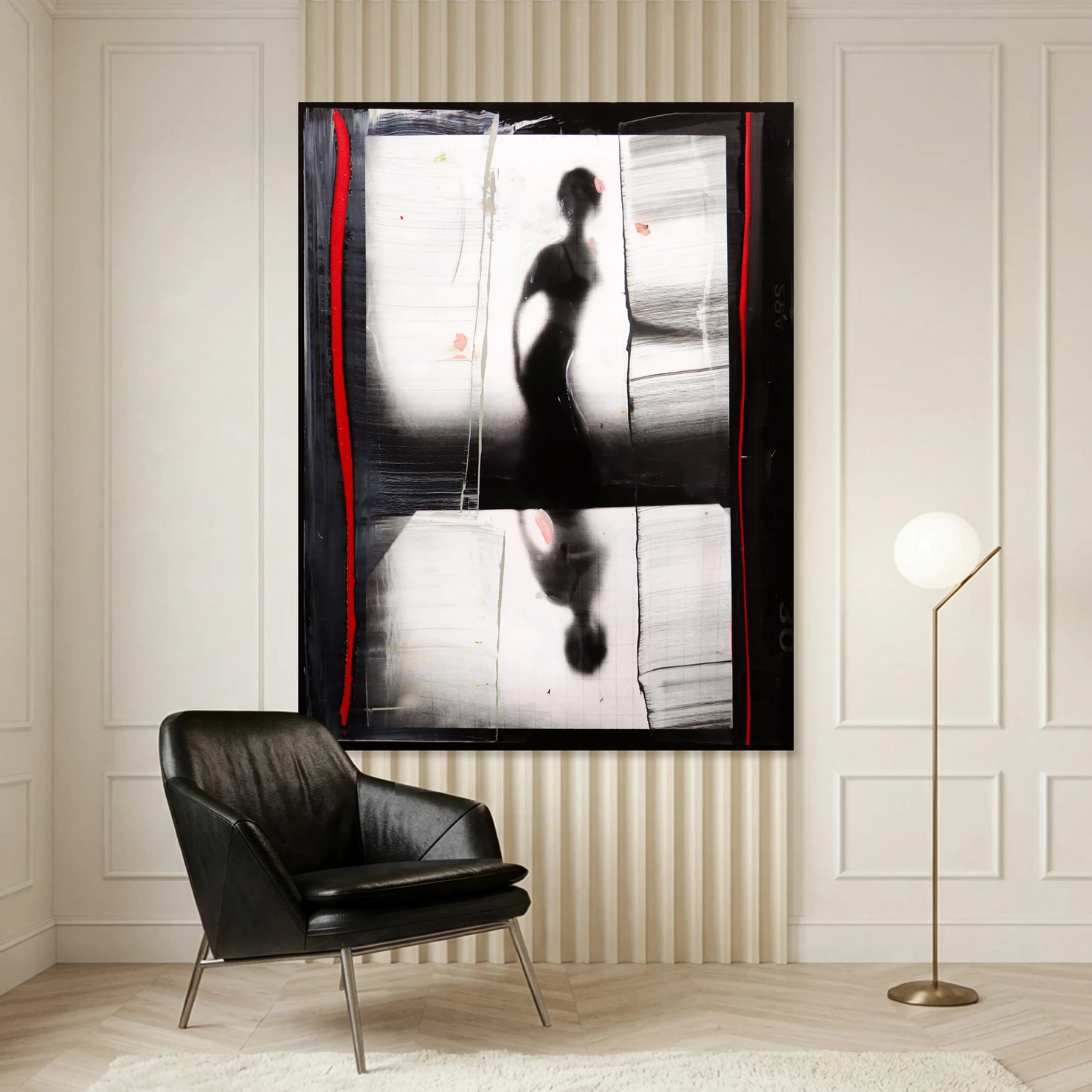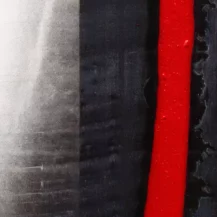 Compoziția este dominată de contraste puternice alb–negru, întrerupte de accente verticale roșii, care introduc ritm, energie și profunzime emoțională. Texturile stratificate și liniile gestuale creează o senzație de mișcare și reflecție, ca o dublare simbolică a corpului și a sinelui interior.