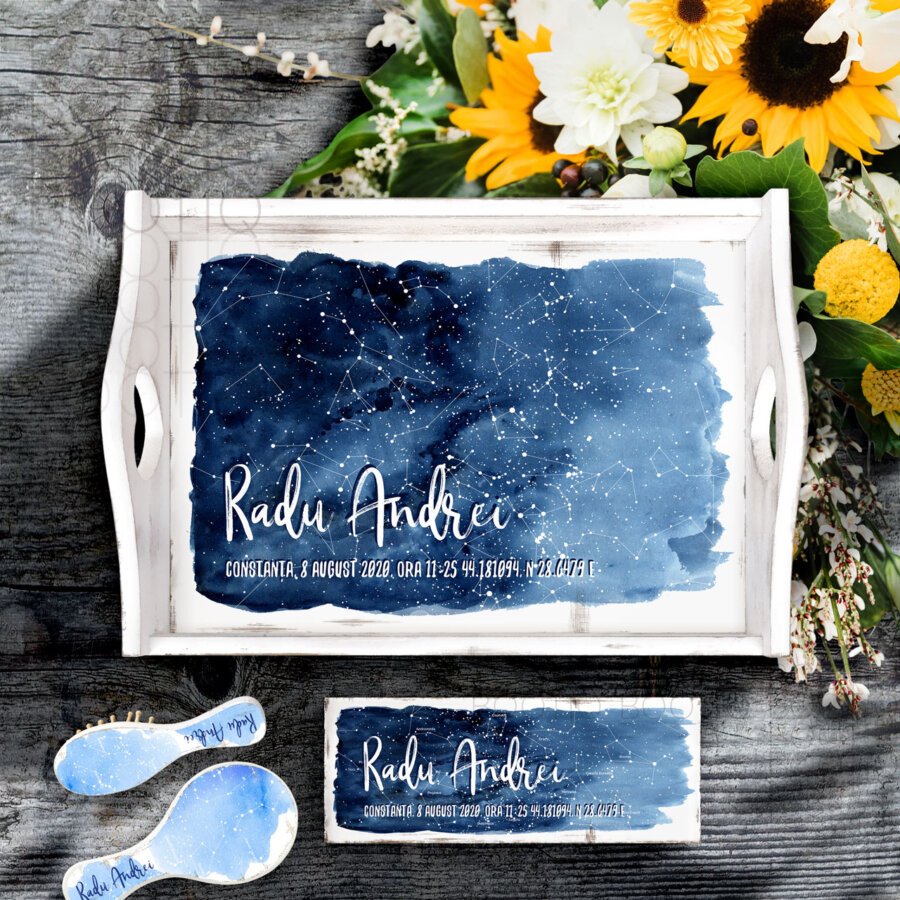 Optional poti comanda accesorii precum perie si oglinda, semne aniversare, seturi de tricouri aniversare, jucarii plus, cutii din lemn pentru amintiri, magneti tip marturie sau chiar tablouri decorative – toate personalizate in aceiasi tematica.