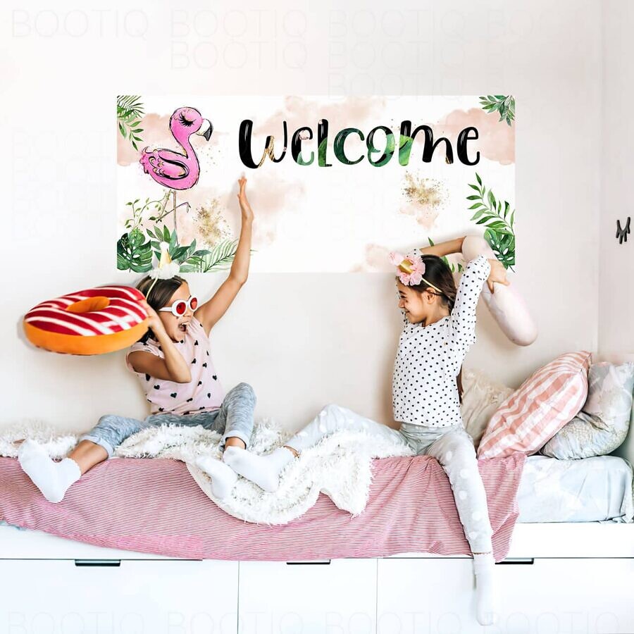 Imprimat pe o hartie speciala in format orizontal – semnul de bunvenit se lipeste pe perete pentru a da o nota tematica, in acelasi stil, incaperi in care organizezi petrecerea.