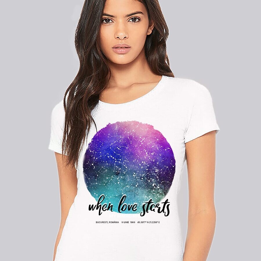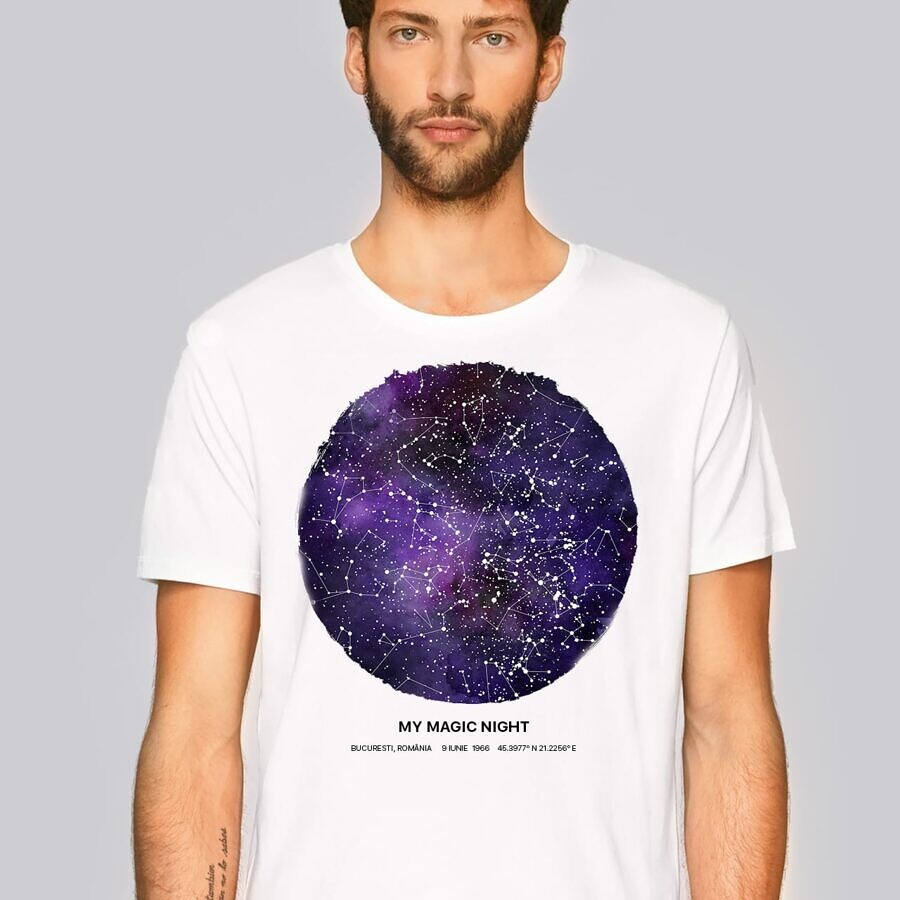Un tricou personalizat watercolor cu harta stelelor de 50x50cm din noaptea în care inima ta a sărit o bătaie.