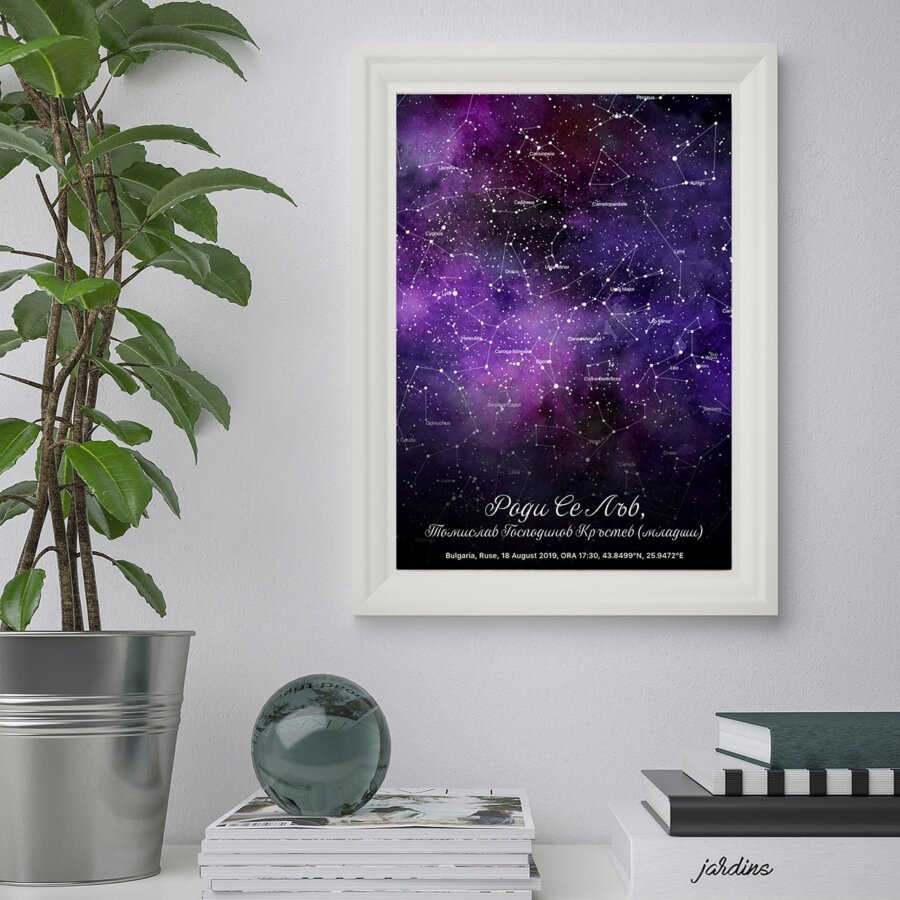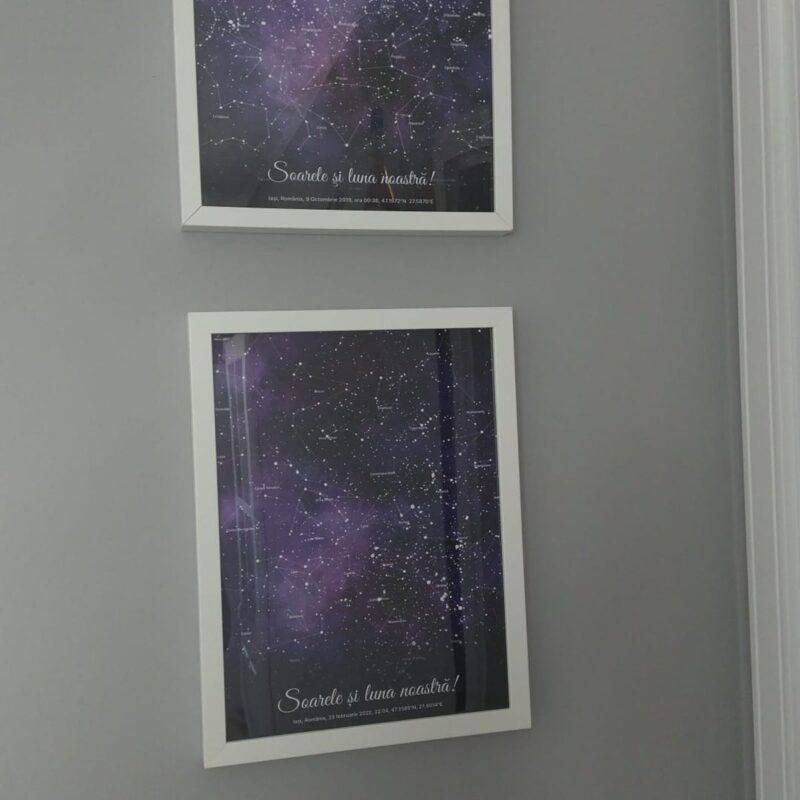 Creați o hartă a stelelor de dimensiune A4 (21×30 cm + rama) sau A3 (30x40cm + rama), pentru noaptea în care inima ți-a sărit o bătaie, perfecta pentru a fi tinuta pe birou sau noptiera. Folosim cele mai noi tehnlogii de imprimare astfel incat tabloul tau sa fie la cea mai înaltă calitate.