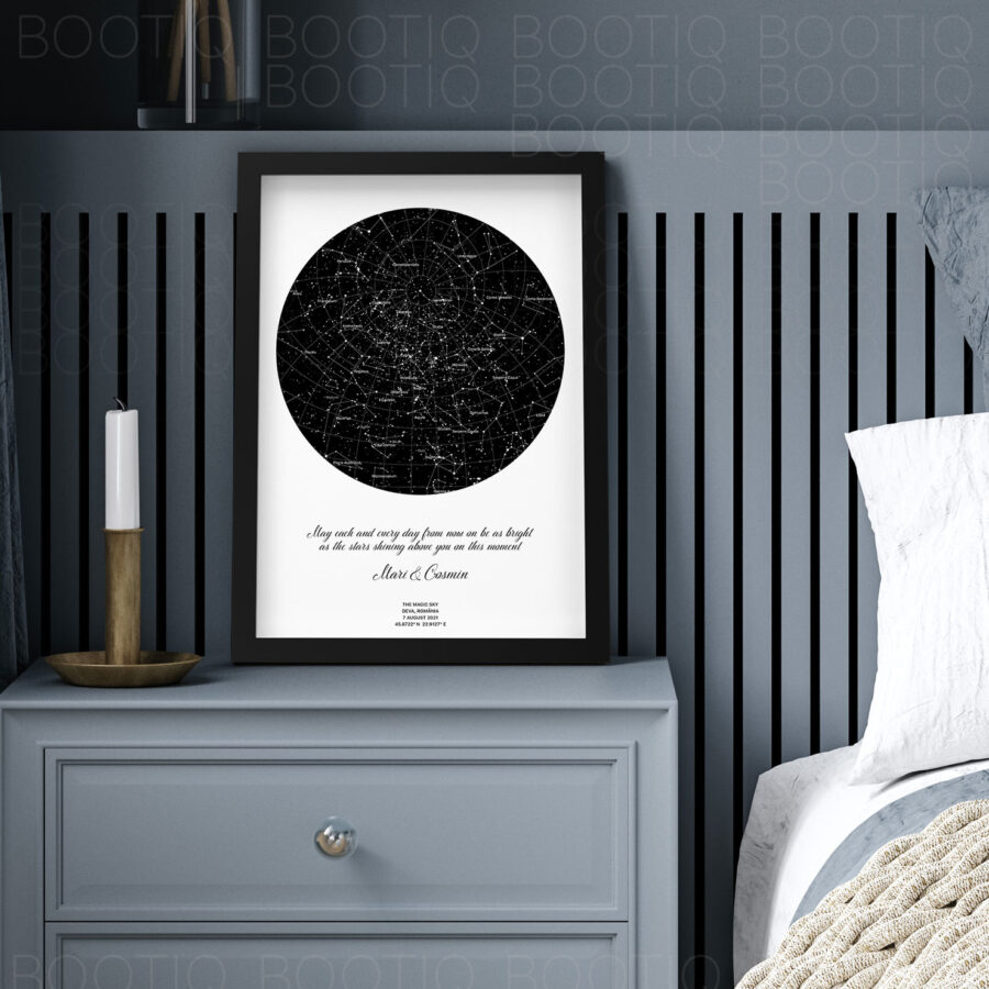 Creați o hartă a stelelor de dimensiune 21x30cm sau 30x40cm, pentru noaptea în care inima ți-a sărit o bătaie, perfecta pentru a fi tinuta pe birou sau noptiera. Folosim cele mai noi tehnlogii de imprimare astfel incat tabloul tau sa fie la cea mai înaltă calitate.