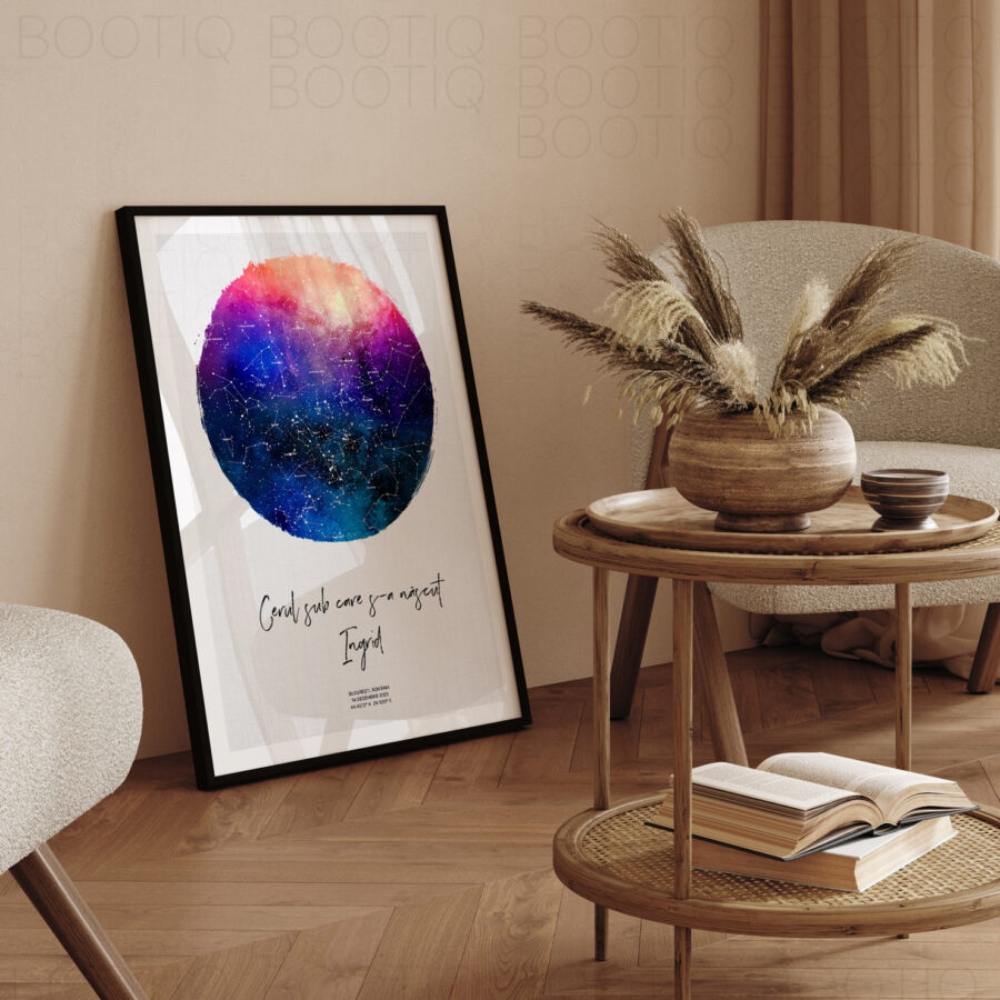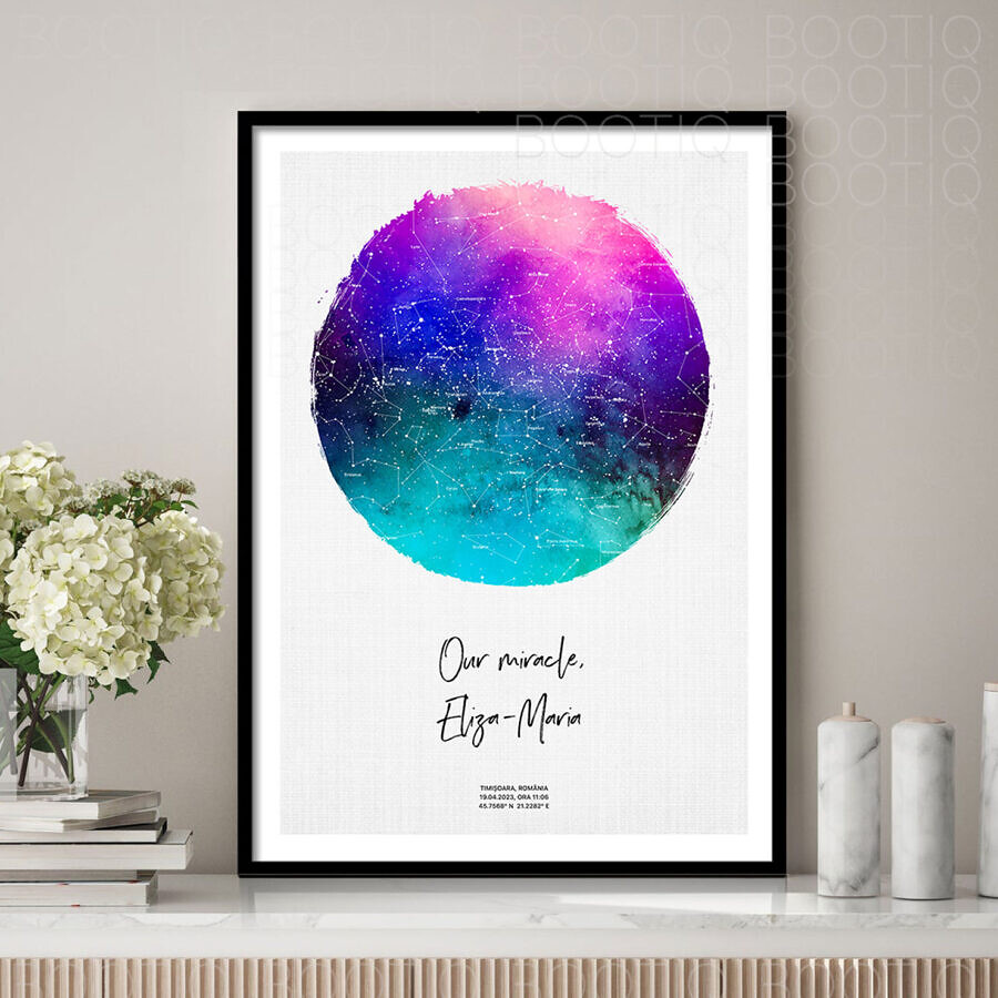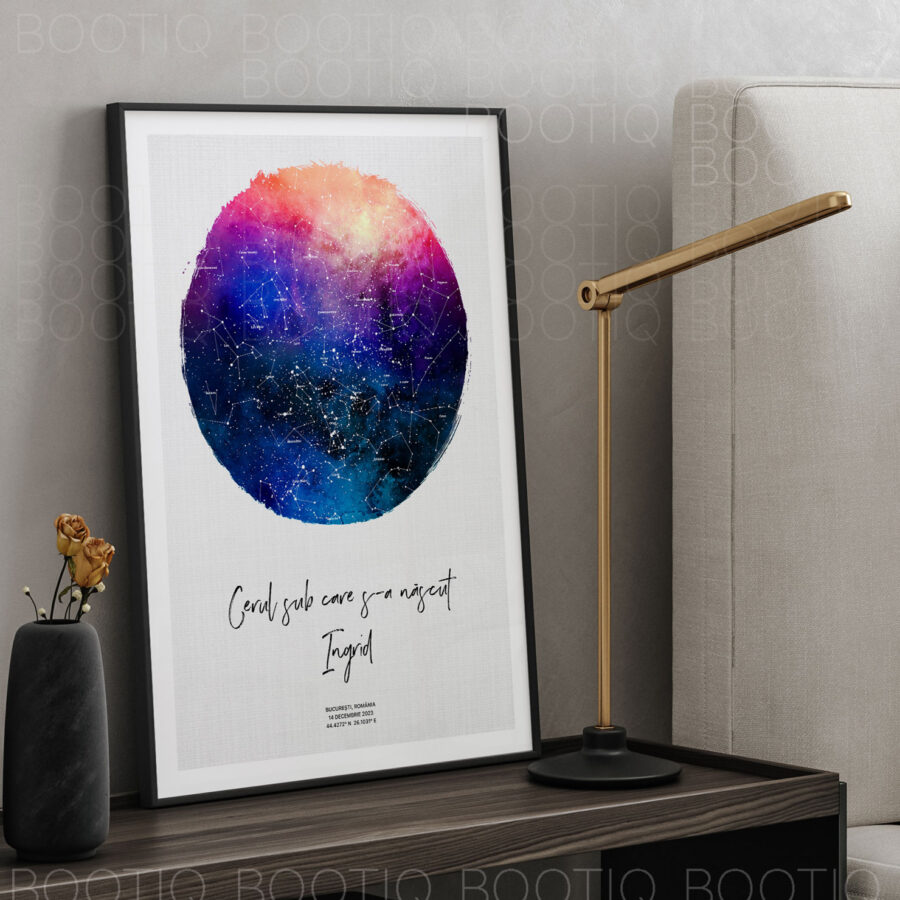 Tablou Personalizat Special: „The Magic Sky Watercolor” – harta stelelor din clipa in care inima ta a inceput sa bata mai puternic!