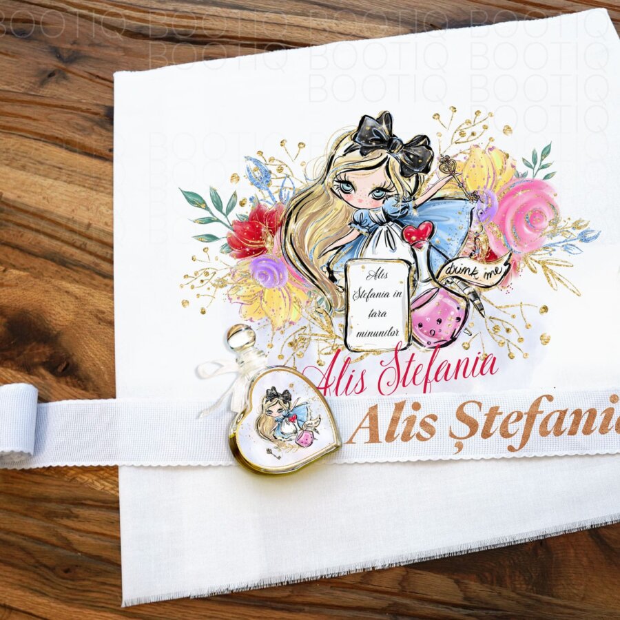 Alice in Tara Minunilor – Trusou Botez – Cutie personalizata din lemn pentru amintiri, botez sau aniversare