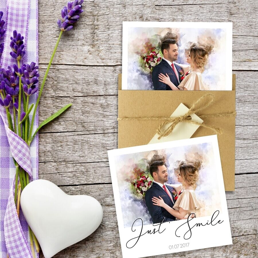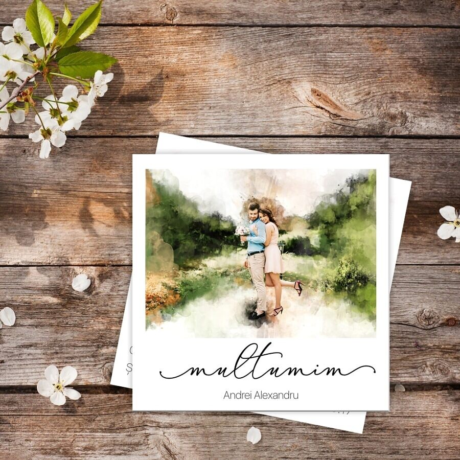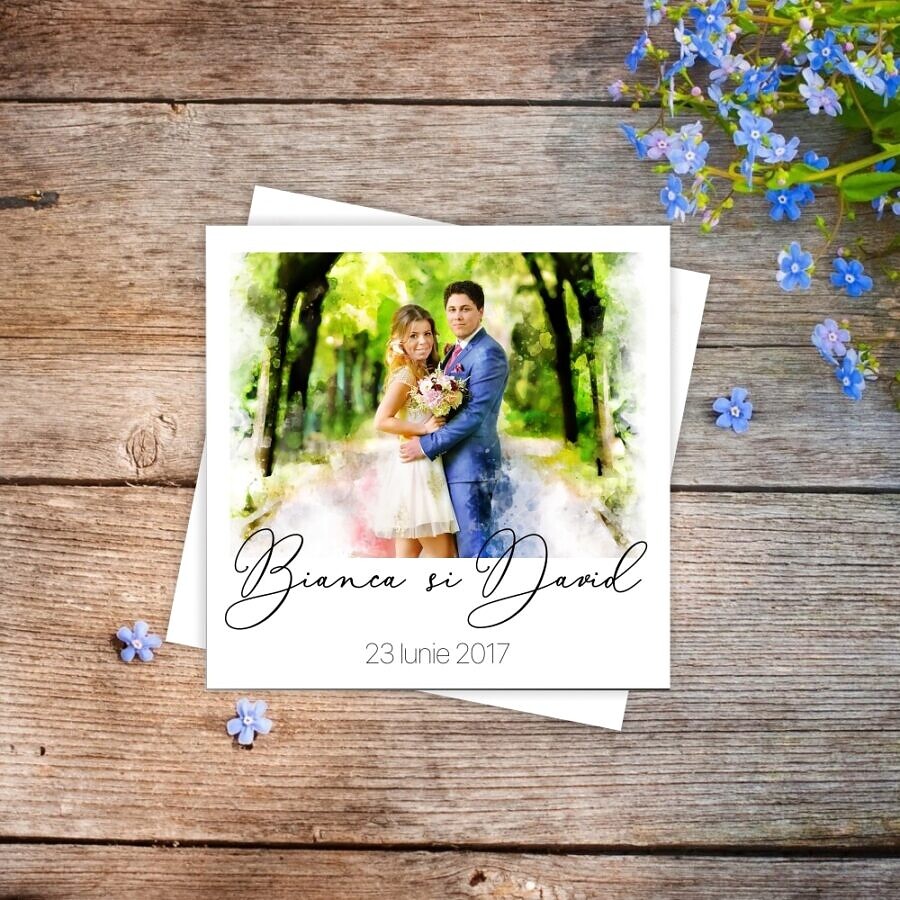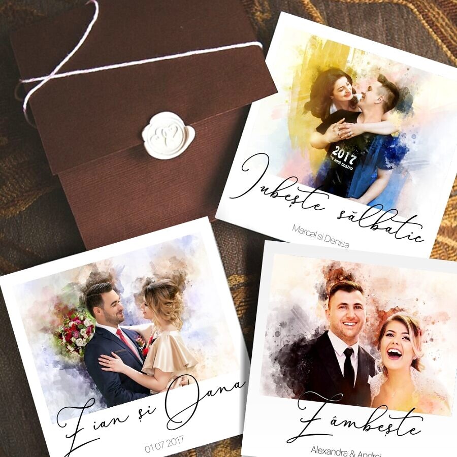 Gandindu-se la milioanele de povesti de dragoste ce se oficializeaza zilnic, designerii nostri au creat un model de marturii pentru nunta cu totul special. Marturiile watercolor sunt printate pe o hartie magnetica speciala, fiind personalizate cu poza voastra preferata. Imaginea este prelucrata de designerii nostri intr-un stil watercolor cu adevarat magic, se prelucreza o singura imagine.